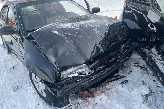 На кадрах с места аварии — два чёрных автомобиля с глубокими вмятинами на неширокой дороге. Судя по всему, одна из машин врезалась на перекрёстке в боковую часть другой.