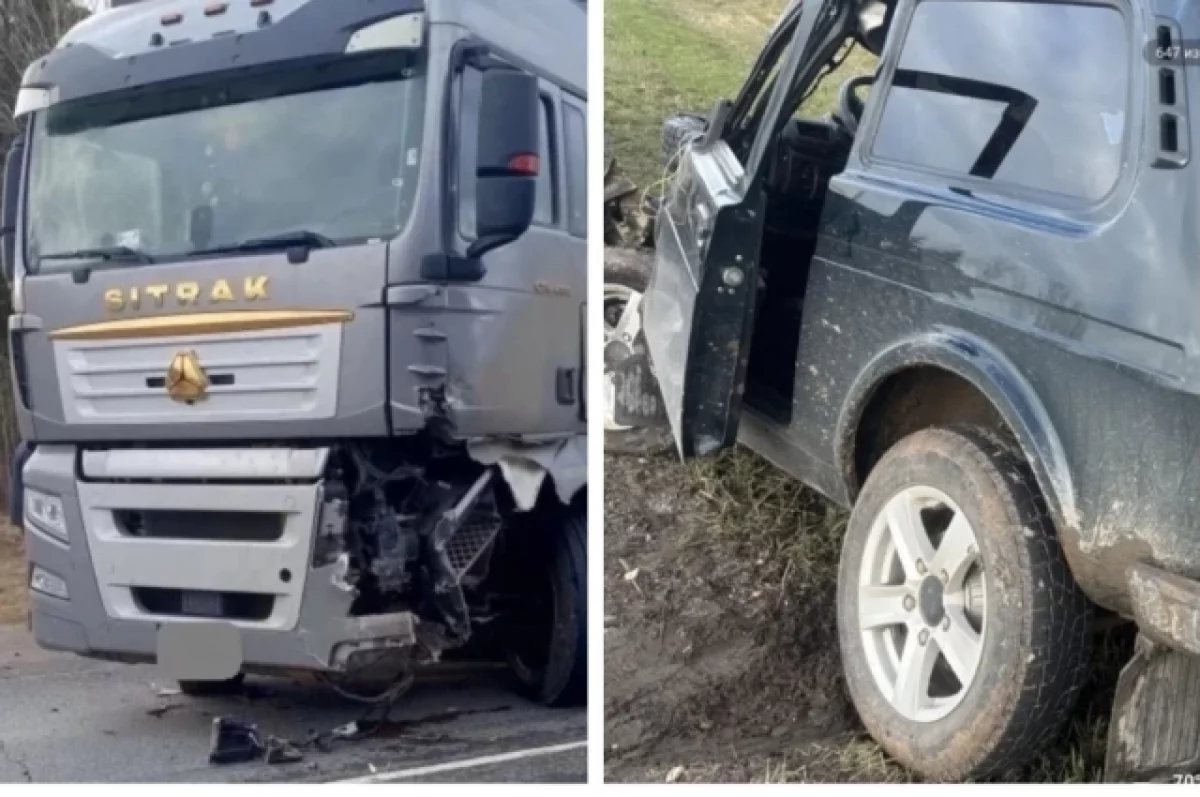 На фото с места аварии — огромный грузовик с повреждениями в передней части кабины и небольшая «Лада Нива» с искорёженным капотом. Рядом валяются обломки металла.