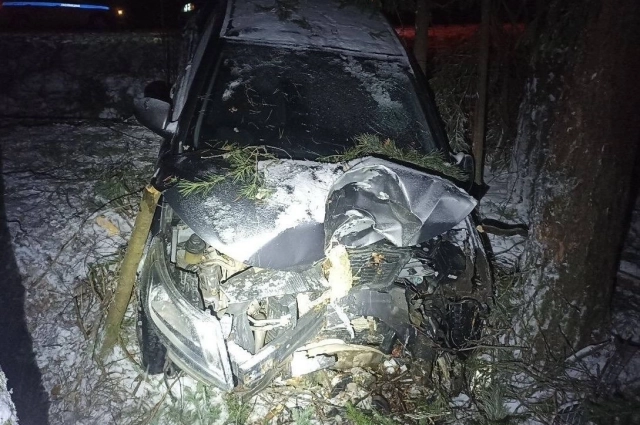На фотографиях с места аварии, опубликованных сотрудниками госавтоинспекции, — влетевший в хвойное дерево автомобиль. От удара капот машины серьёзно смялся и приподнялся, под ним заметен мотор, на автомобиле лежат ветви ели.