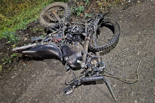 На кадрах с места аварии, опубликованных сотрудниками ведомства, — легковая машина с разбитыми стёклами и глубокой вмятиной в левой части и лежащий в грязи серьёзно повреждённый питбайк.