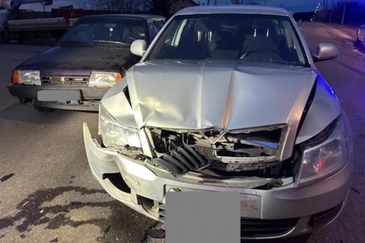 На фото с места ДТП — «Фольксваген», в заднюю правую часть которого врезались «Лада». Судя по кадрам, оба автомобиля двигались в попутном направлении.