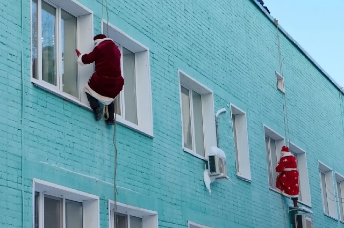 Речь идёт о двух добровольцах, которые в новогодних костюмах Дедов Морозов с помощью альпинистского снаряжения спустились с крыши, чтобы удивить и порадовать ребят, проходящих лечение в Центре травматологии, ортопедии и нейрохирургии Кирова.