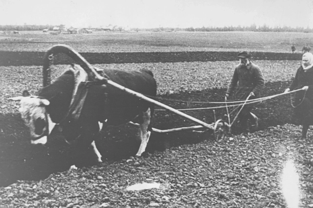 Свой вклад в достижение Победы внести крестьяне. Именно на их плечи пала трудная задача по обеспечению фронта и тыла сельскохозяйственной продукцией. А сделать это было очень сложно. Из аграрного сектора изъяли треть рабочих лошадей, 40% тракторов, почти 80 % автомобилей. Уборка с помощью комбайнов в области находилась на уровне 3%. Пахать землю и перевозить грузы часто приходилось с помощью быков. Как раз такой момент запечатлён на снимке, который сохранился в Госархиве региона.