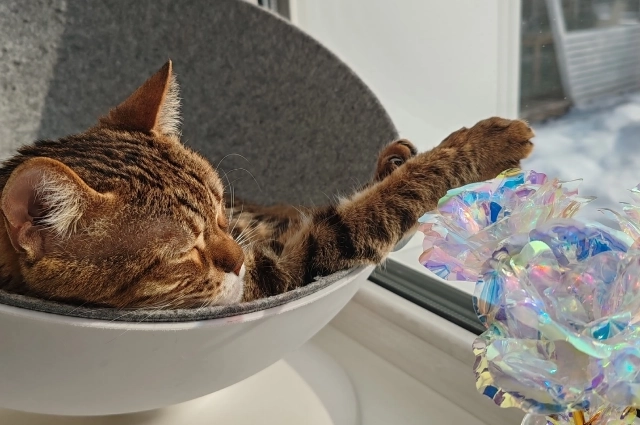 «В последнее время она у нас „охотится“ на снегирей, чечёток, синиц, что прилетают к кормушке на окне. Спрячется за цветок, и выжидает. Потом прыжок — дзынь — и снова в укрытие», — делится Светлана.