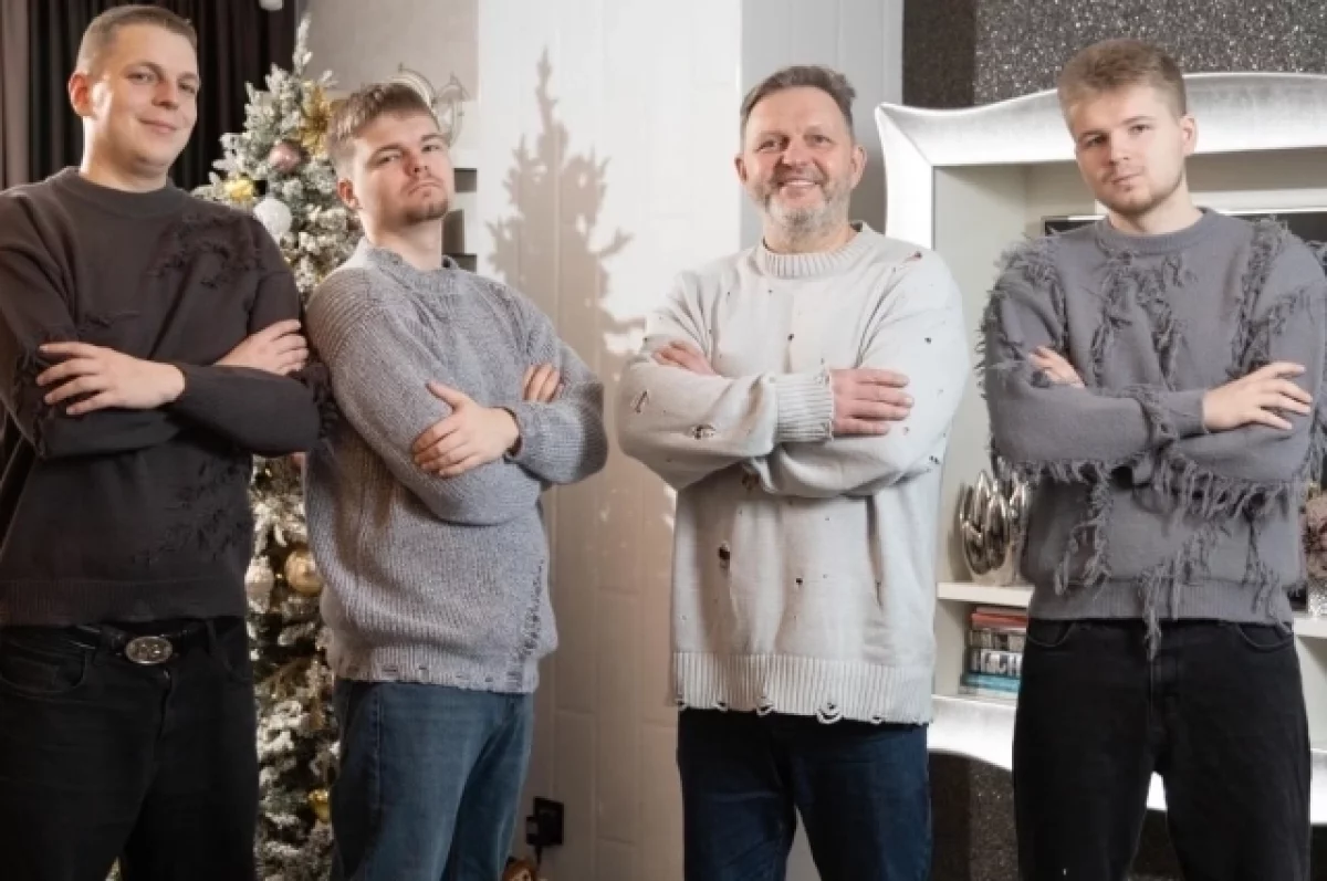 На снимке — бывший чиновник в компании троих сыновей в свитшотах с «рваным» эффектом. Он пояснил, что одежду для фото его наследники выбрали сами.