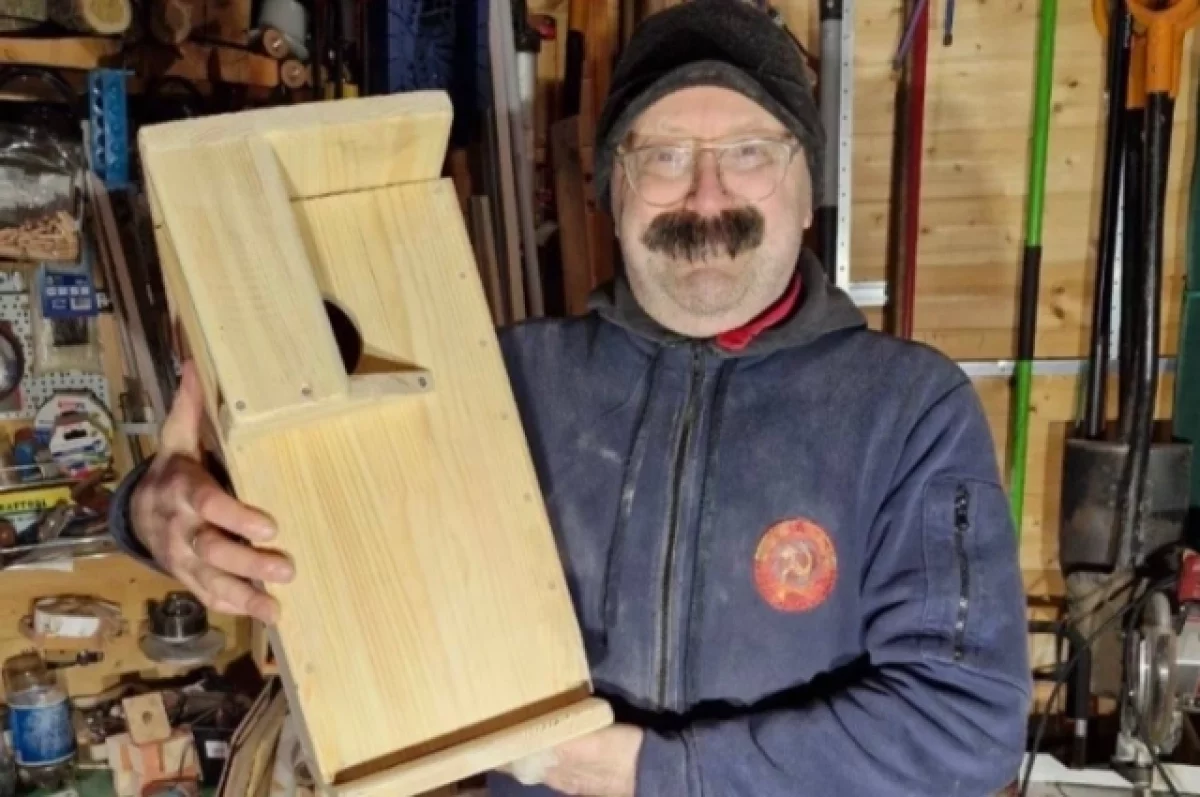 К сообщению бывший политик приложил фото из мастерской, на котором он позирует с только что изготовленным домиком для белок.
