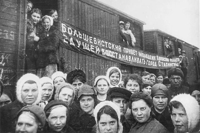 Несмотря на то, что условия жизни тогда были тяжелейшими, люди отдавали последнее, чтобы помочь фронту: сверхурочно работали, ставили трудовые рекорды, отправляли вещи, деньги, ехали в освобождённые от врага регионы, чтобы помочь в их восстановлении. Отработав тяжёлую смену, рабочие находили силы на дежурство в госпиталях, сдавали кровь для раненых. В 1943 году часть комсомольцев отправилась помогать восстанавливать Сталинград.