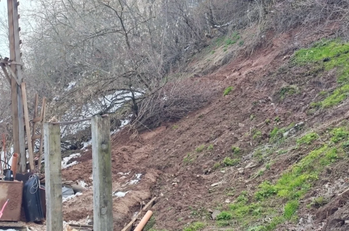 Об оползне сообщил житель дома №33. Парламентарий осмотрел склон и подтвердил, что земля действительно сошла на участок из-за талых вод, размывающих гору под Водопроводной.